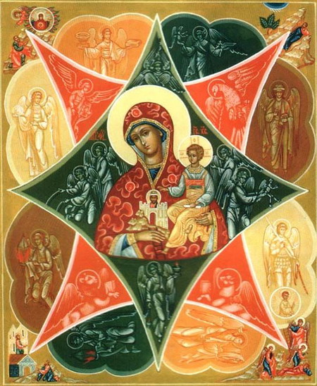 «Сходство между неопалимою купиною и Матерью Божьей заключается в том, что как ветхозаветная купина оставалась невредимой во время охватившего её огня, так и Пресвятая Дева Мария, родившая Иисуса Христа, до Рождества и после пребывала Девою. Икона Богородицы «Неопалимая Купина» изображается в виде восьмиугольной звезды, состоящей из двух острых четырёхугольников с вогнутыми концами. Один из них – красного цвета, напоминающий собою огонь, объявший виденную Моисеем купину; другой – зелёного цвета, указывающий на естественный цвет купины, который она сохранила, объятая огненным пламенем. В середине восьмиугольной звезды, как бы в купине, изображена Пречистая Дева с Предвечным Младенцем. По углам красного четырёхугольника изображен человек, лев, телец и орёл, символизирующих четырёх евангелистов. В руках Пречистой Девы лестница, прислоненная верхним концом к Её плечу. Лестница означает, что через Богородицу на землю сошёл Сын Божий, возводящий на Небо всех верующих в Него» Истина лежит вдали от этой богословской глупости. Мария Владимировна изображена в Колеснице Куба или в Неопалимой Кубине, образованной астральными пирамидами, вращающимися вокруг праны Богоматери и вписанными в сферический кокон (сферу Леонардо). Управлением Колесницей Бога Мария Владимировна могла творить разнообразные чудеса, в том числе устанавливать защитный Покров над предметами и целыми территориями. Красный ромб означает солнечную пирамиду, а зеленый ромб олицетворяет земную пирамиду. Согласно теории Колесницу Куба сопровождают одиннадцать (иногда изображают двенадцать) ангелов-хранителей и четыре архангела. Лестница Богородицы означает возможность перемещения между земной жизнью и Царством Небесным. Оператор Колесницы Бога может свободно перемещаться по Вселенной и квантовым мирам.