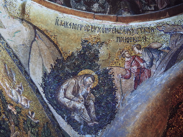 | Фигура 10. Опечаленный Иоаким сидит в пустыне в кустах (юго-восточный парус северного купола внутренний нартекс). Справа от него изображены два пастуха. Мозаика сверху повреждена. Поверх штукатурки и остатков мозаики нанесена надпись, поясняющая страдания Иоакима. Мы полагаем, что надпись сделана недавно в благих намерениях реставраторами мозаики. Согласно Иакову Иоаким ходил в пустыню поститься и молиться 40 дней, где обрел весть о рождении ребенка Анной. Согласно нашей реконструкции, мы полагаем, что Иоаким это монах, который участвовал в судьбе императрицы Анны, жены русского Князя Владимира – Василия, как духовный Отец. Поэтому на всех мозаиках Иоаким одет как монах в простую одежду. Даже у пастухов одежда богаче. Физический отец будущей Богородицы это Князь Владимир. Протоевангелие от Иакова делает попытку придать благообразный вид духовной дружбе Анны и Иоакима при том, что у Анны есть муж Владимир, ведущий в то время не совсем приличный образ жизни.