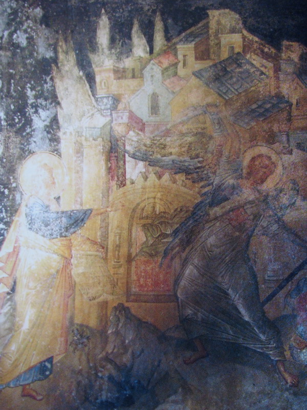 | Фигура 21. Война с ассирийцами в Иерусалиме, софит западной арки с южной стороны свода. Композиция изображает сцену войны с ассирийцами в Иерусалиме. На переднем плане стоят Святой (слева) и Ангел (справа). На табличке около фрески есть почти не читаемая надпись: «Посему так говорит Господь о царе Ассирийском: не войдет он в этот город» (Ис., 37:33). Фреска имеет повреждения. Обратим ваше внимание на изображение Иерусалима – в центре композиции над городскими воротами (над развивающимся плащом ангела) помещена икона Богородицы с младенцем Иисусом, то есть это Константинополь. Следовательно, ветхозаветные события происходят в Иерусалиме-Константинополе, что противоречит официальной истории, но соответствует истине и канонам Новой церкви Святой Руси. Последние два столетия Православная церковь доказала клиру, прихожанам и всему миру, что она является хранителем древней мудрости и слова Божьего, так как вся информация содержится в неизменном виде тысячи лет и не одна буква Святого Писания и Святого Предания не менялась за истекший период. Именно поэтому церковь является оплотом древних догматов и называется ортодоксальной. Однако мы видим, что церковный комплекс Хора опровергает устоявшиеся парадигму, каноны и стереотипы Православия и является живым свидетелем древних догматов Православия Руси начала XIV века (1315-1321 годы). За сохранение нетленных артефактов христианства мы обязаны быть благодарными мусульманам, которые не уничтожили, но надежно зафиксировали картины и сцены Нового Завета в Церкви Хора, закрасив их штукатуркой в начале XVI века. Изучение знаков, имен и текстов комплекса Хора говорит о том, что первоначально авторы сооружения надписали мозаики и фрески короткими фразами и словами, иногда просто символами. С течением времени мозаики и фрески стали получать повреждения от воздействия атмосферы и регулярных землетрясений, которые проявились также на текстах надписей. Сегодня мы видим, что большая часть надписей не изоморфна полотнам мозаик и фресок. Некоторые фразы написаны поверх основы картин, они нанесены прямо на подложку (штукатурку). В помещении парэкклесия многие цитаты из Библии написаны на табличках рядом с изображениями. Мы полагаем, что большинство надписей были сделаны в более поздний период, чем художественные композиции. Выдвинем гипотезу, по которой большинство надписей Храма Хора были сделаны после захвата турками Константинополя в 1453 году, вплоть до начала XVI века. В этот период, в связи с утратой христианами контроля над Константинополем – Иерусалимом, церковь начала обширную программу по изменению догматов и канонов христианства, так как доступ к Святым местам Константинополя оказался закрыт для верующих. В конце XV века стали утверждаться новые тексты Святого Писания Ветхого и Нового Заветов. С благими намерениями монахи и служители монастыря Хора стали дополнять надписи мозаик и фресок цитатами из Библии, дабы упорядочить вероучение. С момента нанесения картин прошло уже около 300 лет. Увидев эти работы, власть Османской империи распорядилась прекратить искажение Православия и новое написание икон, как деяний, противоречащих Исламу. Посему монастырь был закрыт, все изображения Храма Хора были закрыты штукатуркой, а сама церковь – превращена в мечеть Карие. В 1948 году турецкие власти п